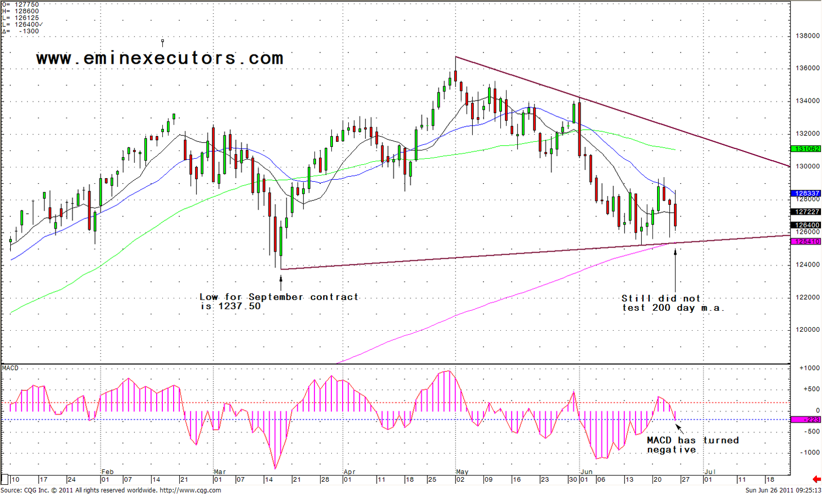 Going into this week I will be watching the overnight trade carefully to see if Friday was just traders closing out their longs before the weekend or if this is something else. I have been saying for awhile now that although the market has been trading weak for the past 2 months no major long term support has yet been broken in the S&P or Dow. I have been saying that our leader is the Dow and I am sticking with that. The Dow Industrials are currently 158 points away from testing their 200 day m.a. (11,776) and 379 points away from their low for the year (11,555). Until the Dow takes out its 200 day m.a. (11,776) and then makes a new low for the year I am not sure that the primary trend of the market has turned bearish. I believe in the Dow Theory for the primary trend of the market (this is not my only tool but an important one). So until the Dow Transports (4,906) and Industrials (11,555) start making new lows for the year at the same time I am not convinced that the primary trend of this market has turned bearish. Going into Monday I think the 200 day m.a. (1263.40) in the S&P will determine the direction for the week. If we can sustain trade above it then I think you will see a rally testing last weeks highs. If we cannot hold the 200 day m.a. in the S&P then I think you could see a sharp sell off in the markets and we will probably test the lows of the year in all of the major Indices. This is where the true test of this market will come. See charts below for more insight on the week ahead.
